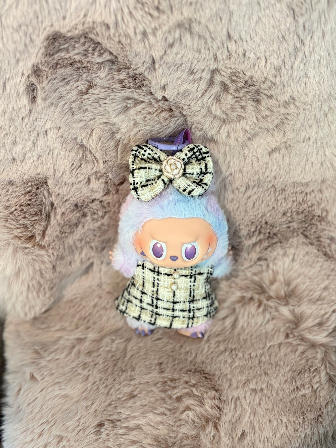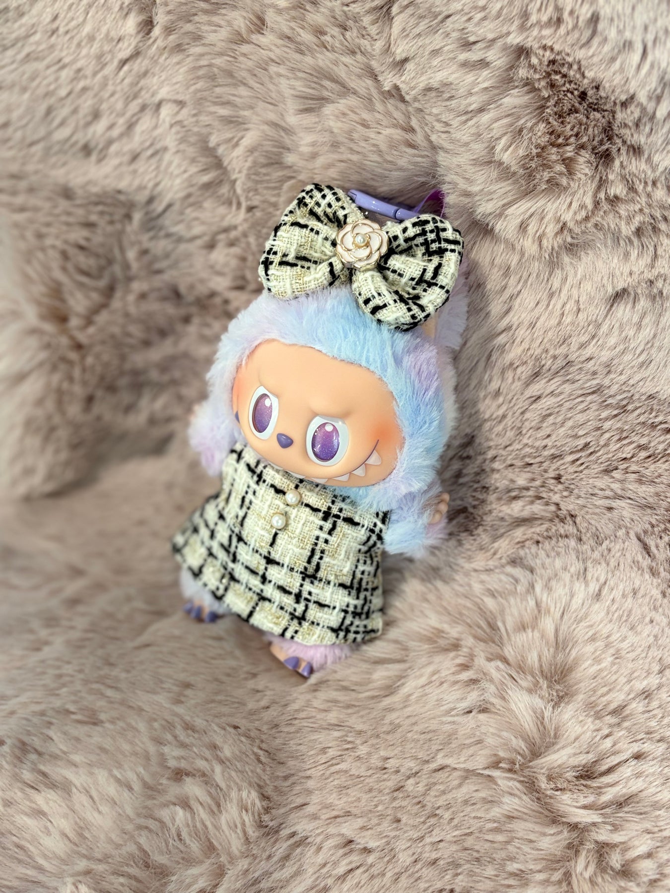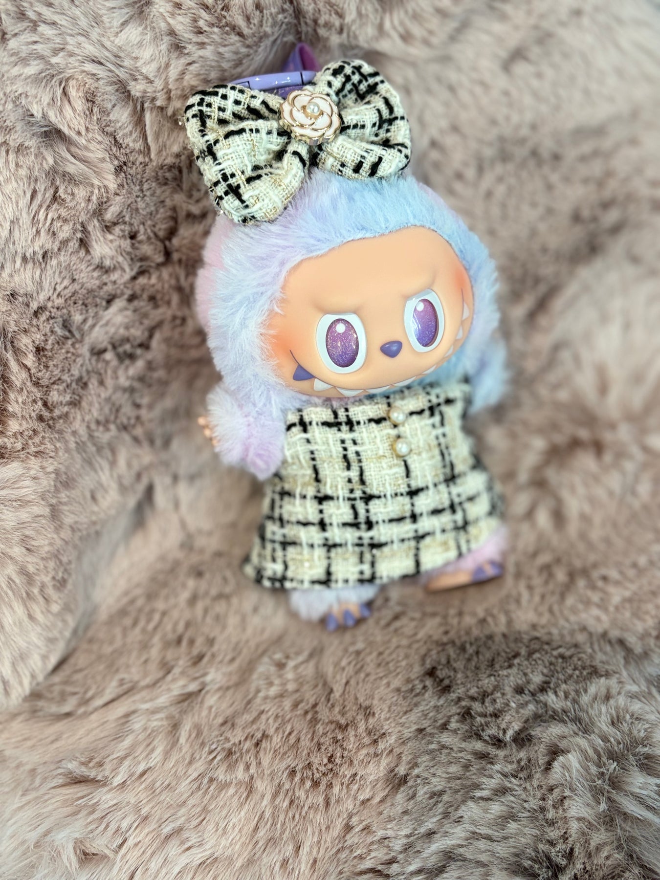 Turn your Labubu or Pop Mart figure into the ultimate fashion icon with this chic two-piece tweed outfit! This set includes a custom-tailored ivory-and-black tweed dress adorned with pearl buttons, paired with a matching oversized bow featuring a rose embellishment—perfectly styled for your luxury-loving collectible.