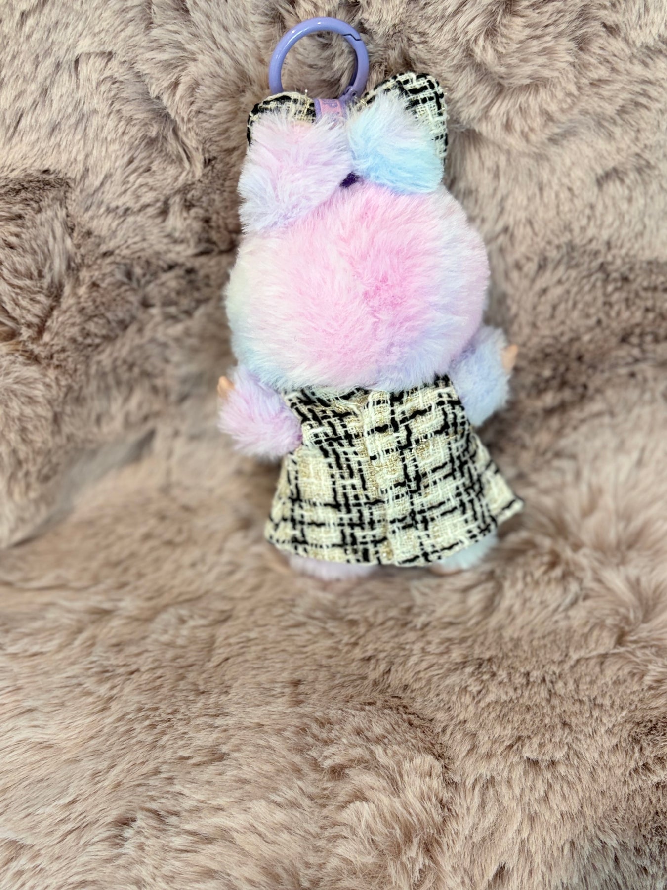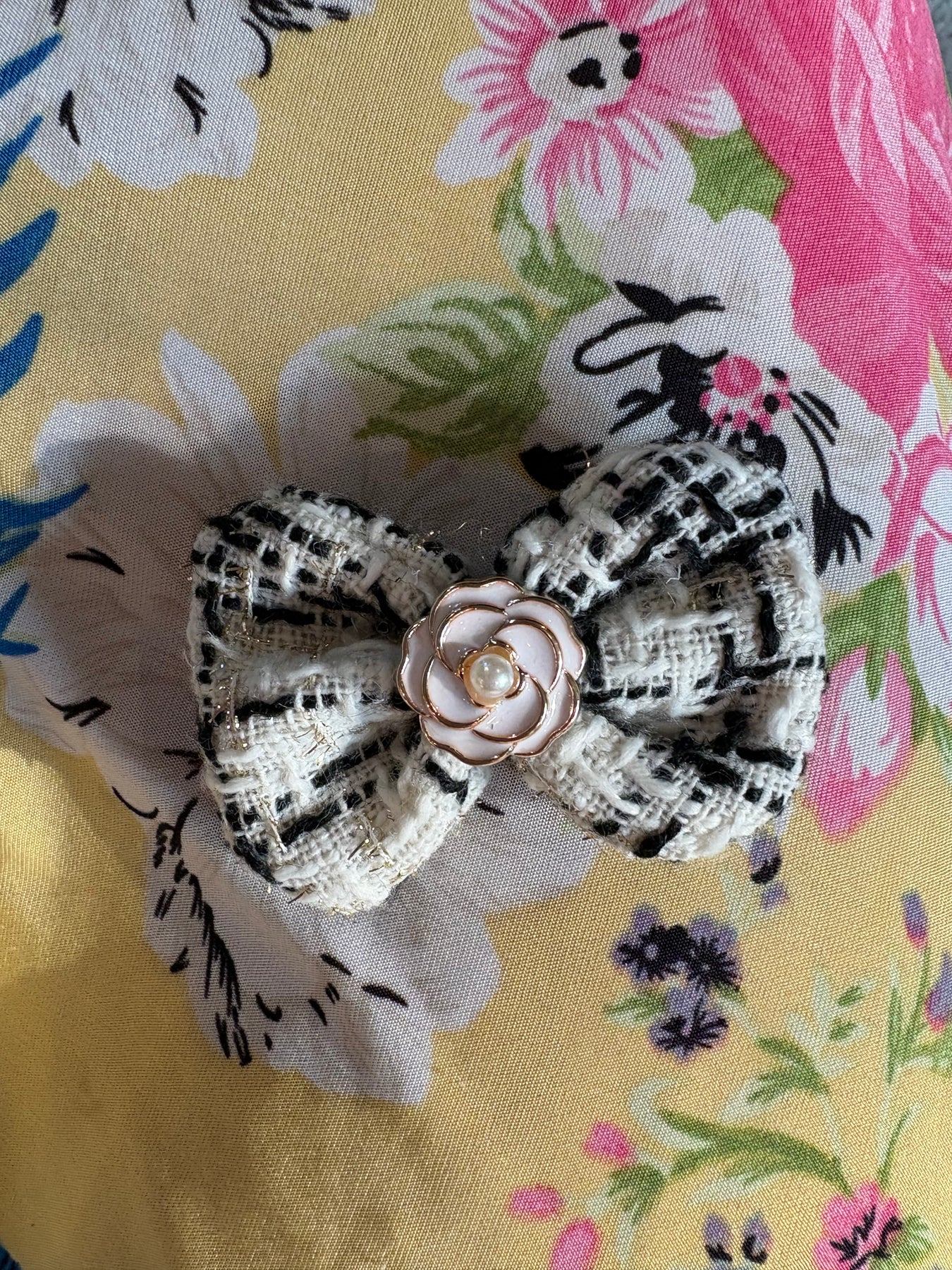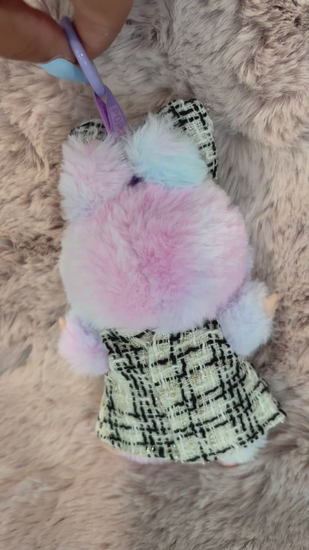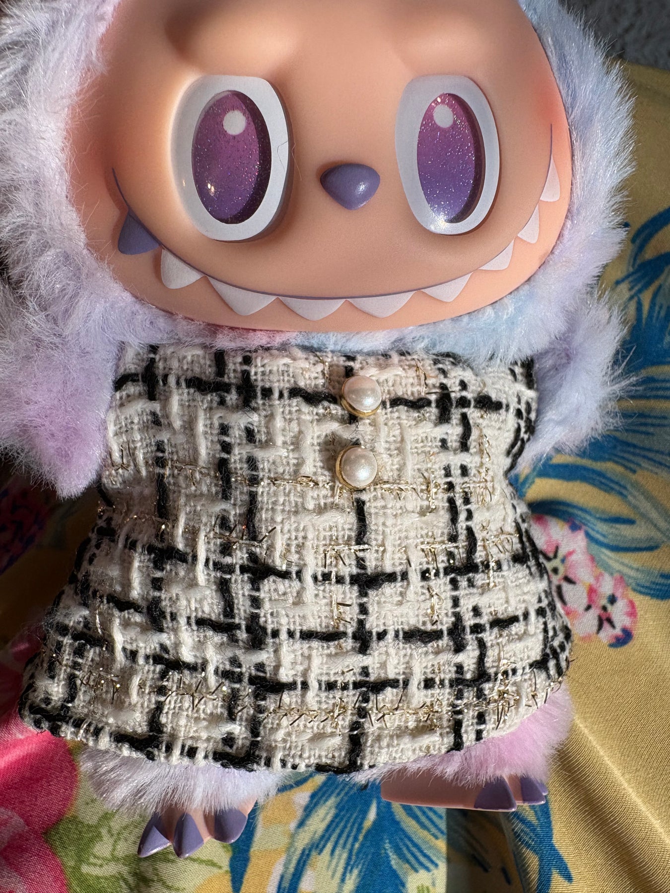 Turn your Labubu or Pop Mart figure into the ultimate fashion icon with this chic two-piece tweed outfit! This set includes a custom-tailored ivory-and-black tweed dress adorned with pearl buttons, paired with a matching oversized bow featuring a rose embellishment—perfectly styled for your luxury-loving collectible.
