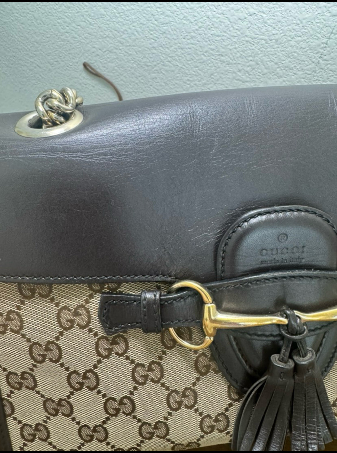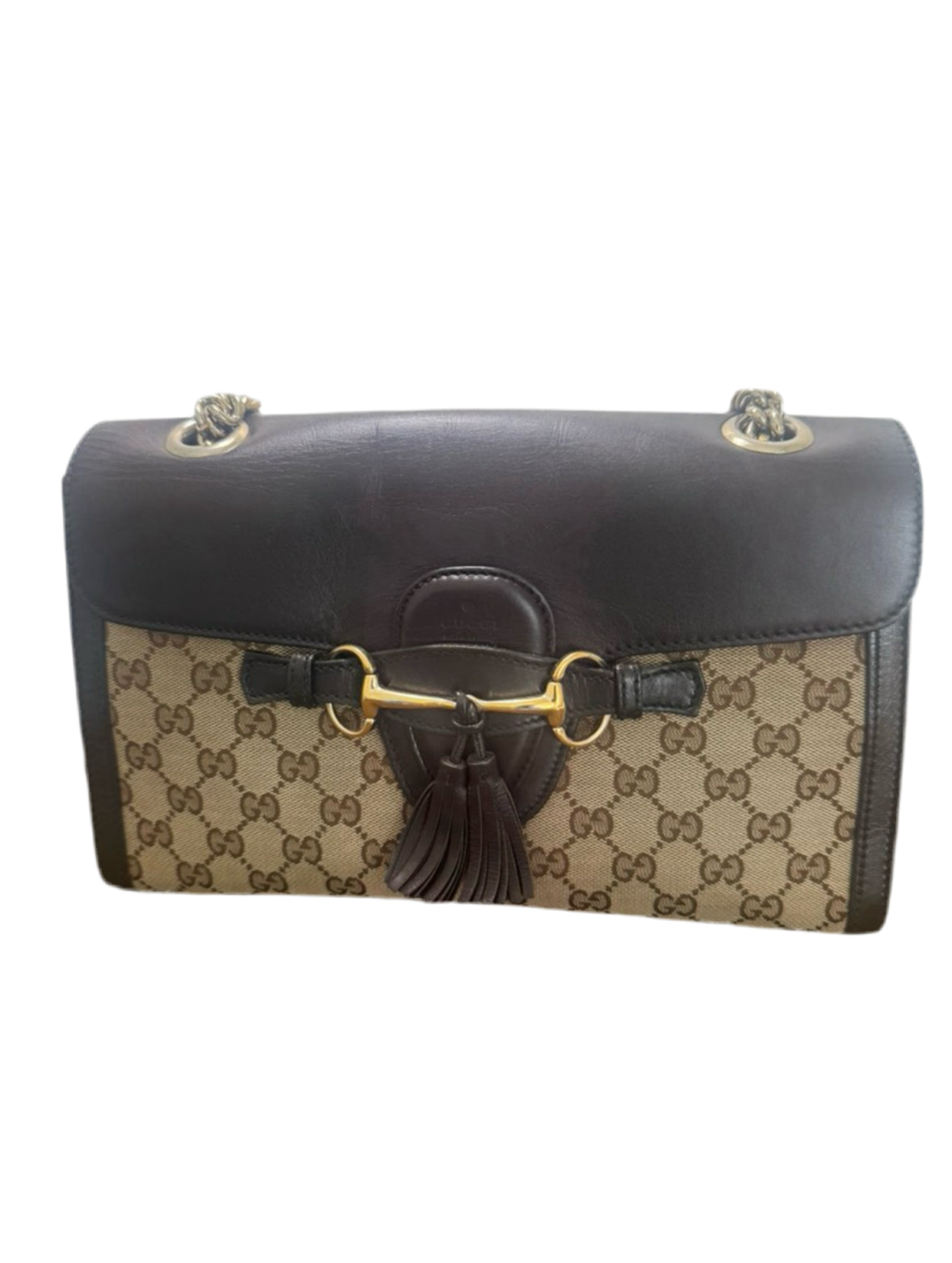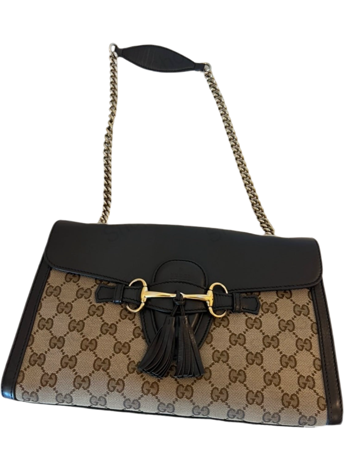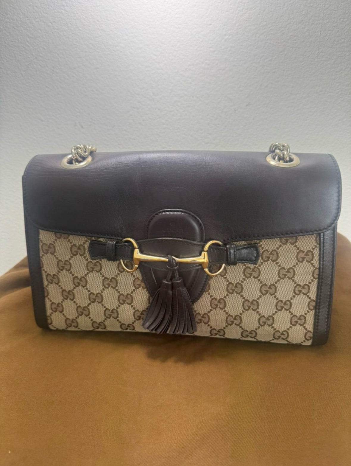 Add timeless sophistication to your collection with the GUCCI Monogram Margaux Calfskin Medium Emily Chain Shoulder Bag. Crafted in Italy, this authentic Gucci bag features the signature beige and ebony GG monogram canvas paired with smooth cocoa calfskin leather accents.
