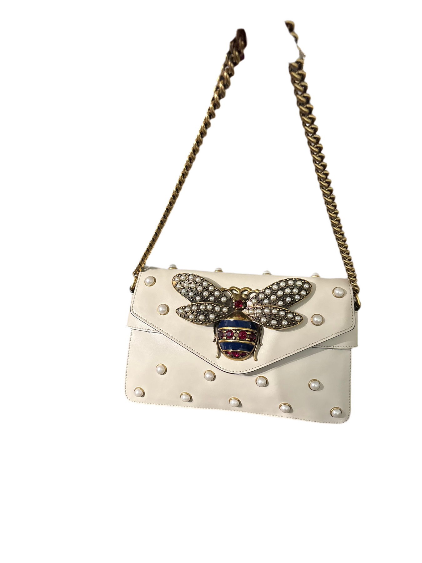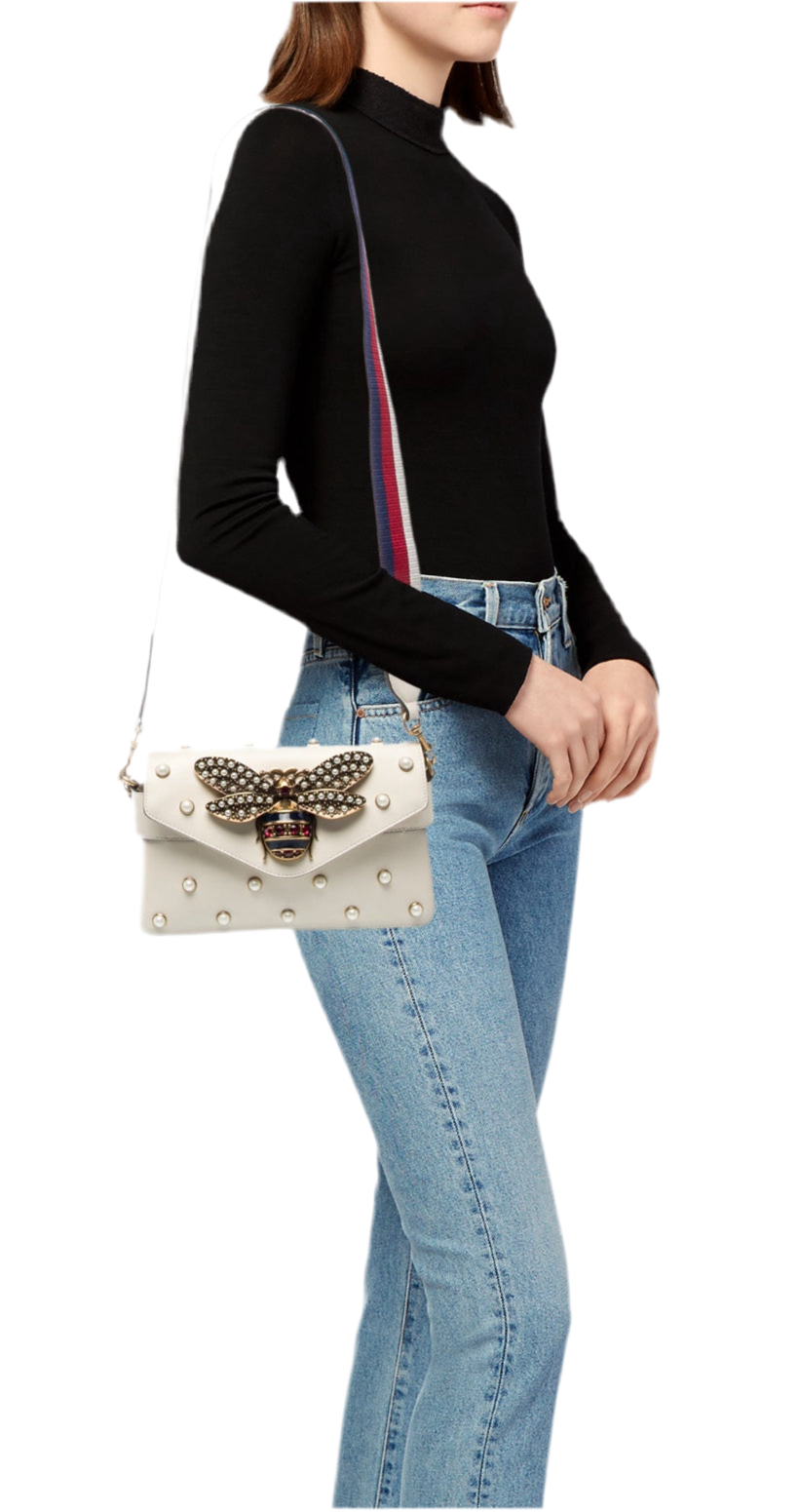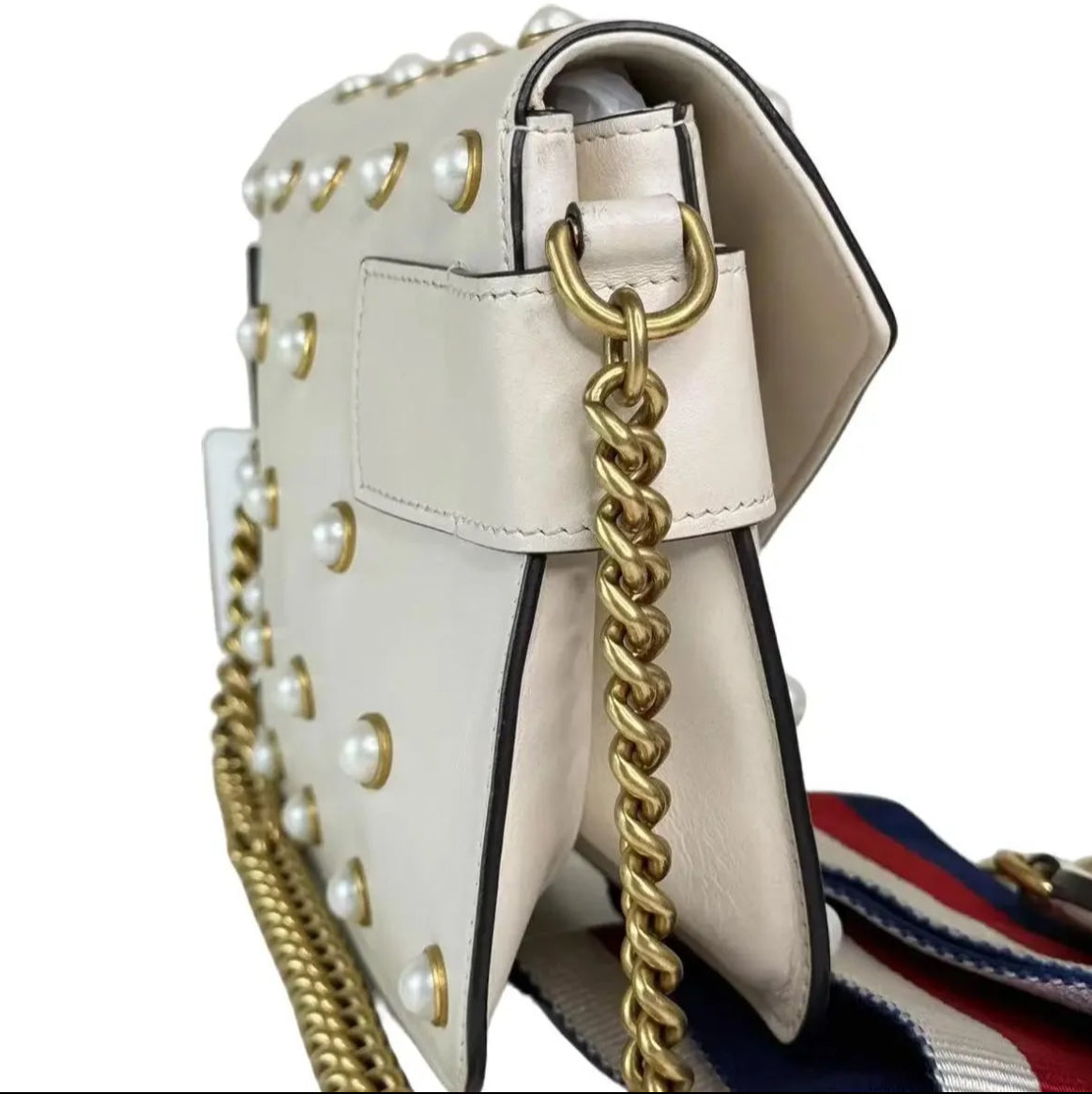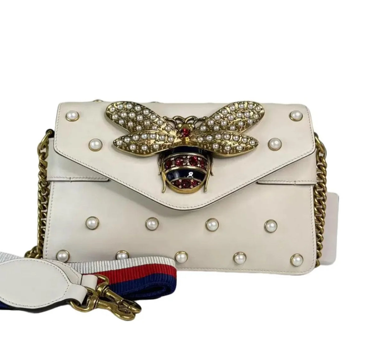 Authentic Gucci Queen Margaret Bee Pearl-Studded Shoulder Bag — White Leather / Web Strap