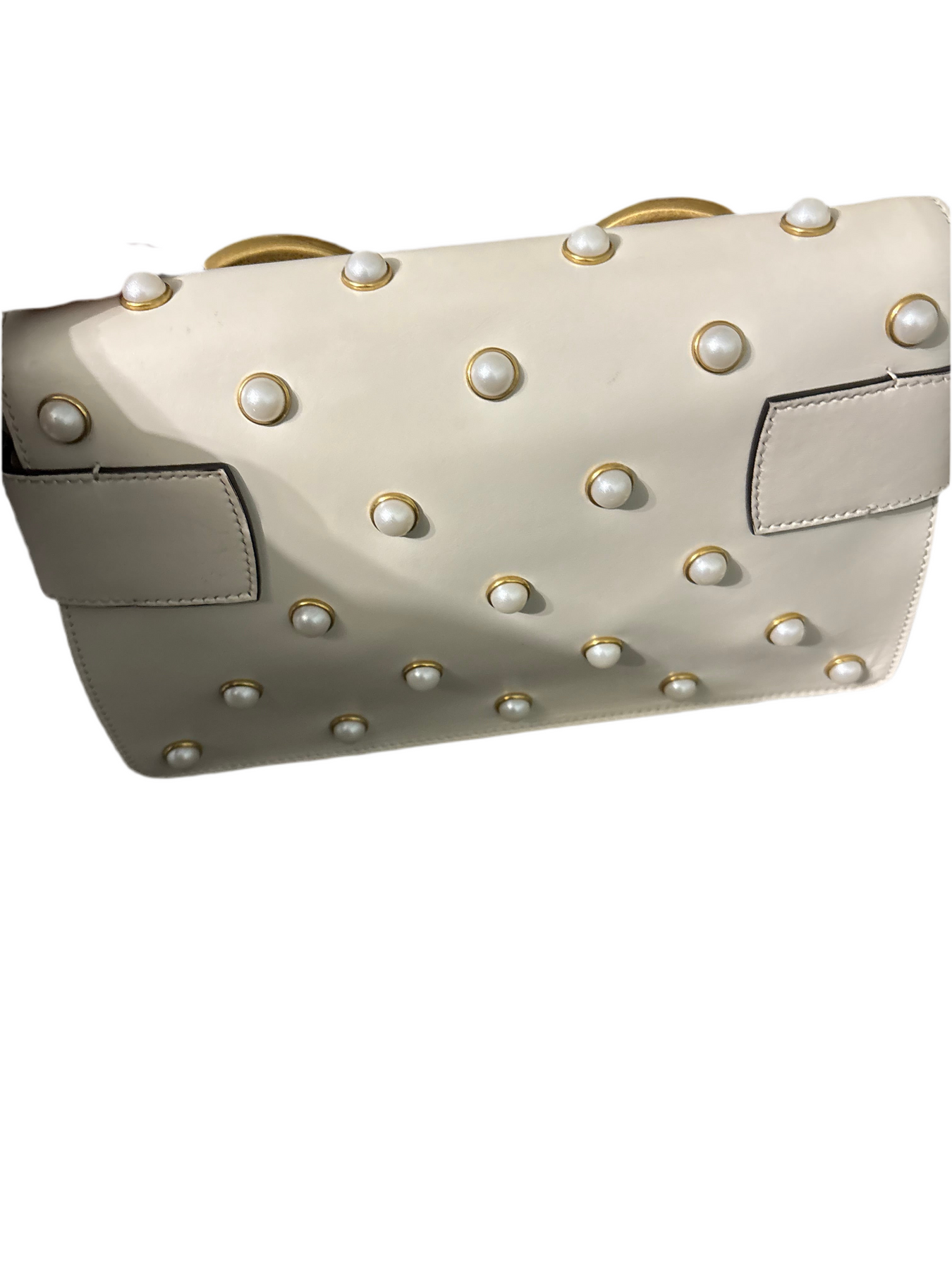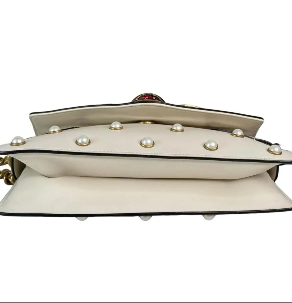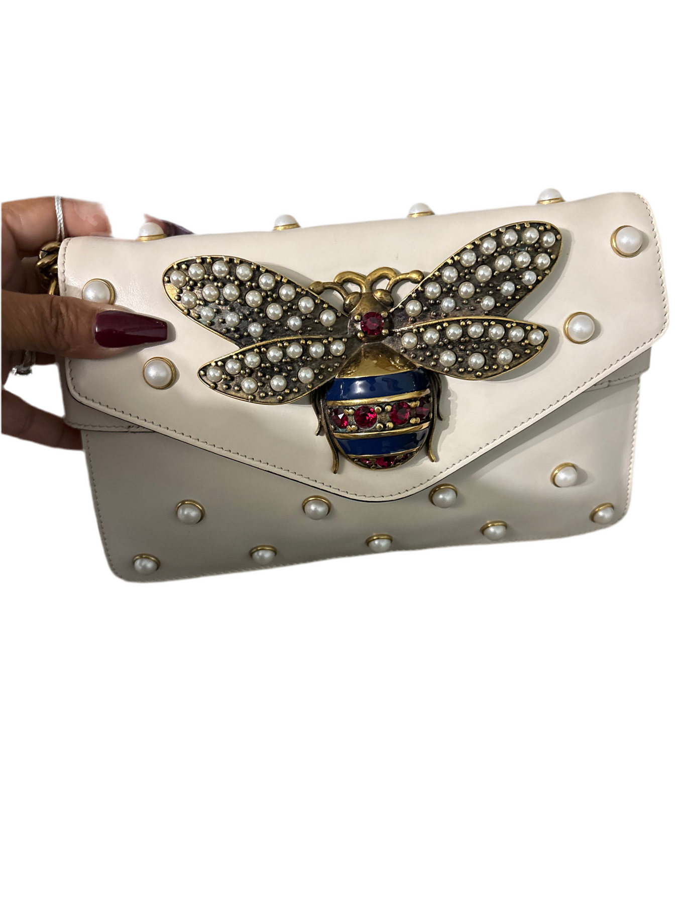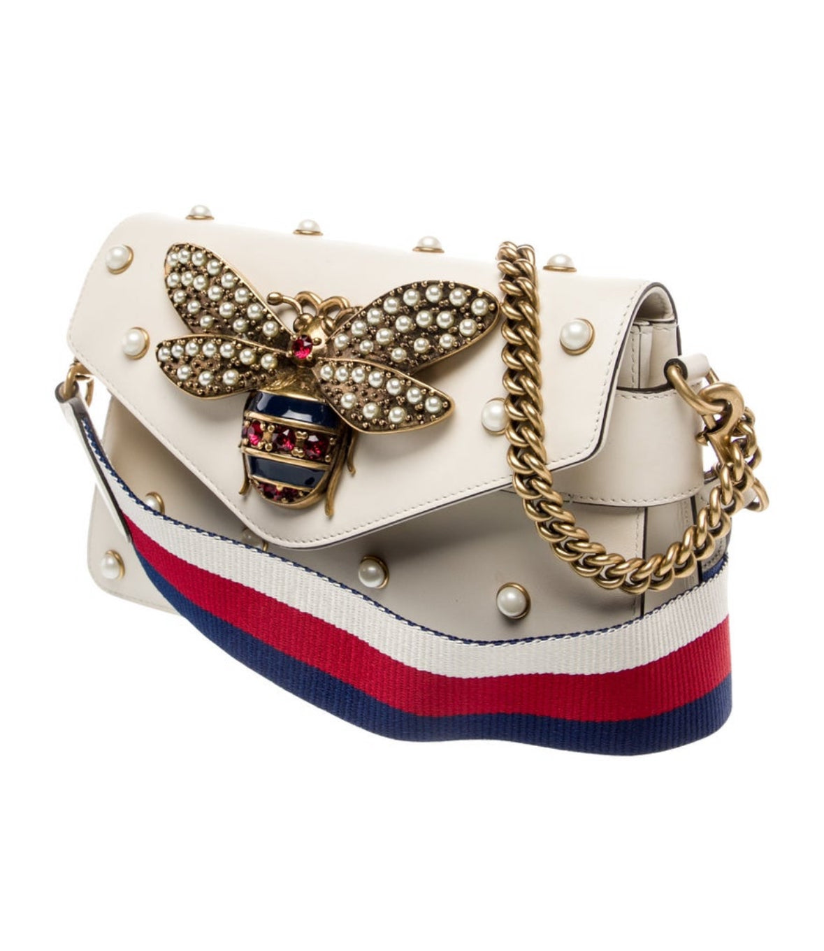 Authentic Gucci Queen Margaret Bee Pearl-Studded Shoulder Bag — White Leather / Web Strap
