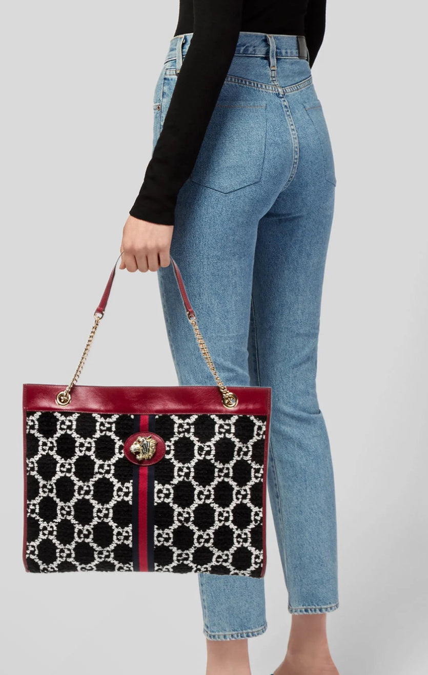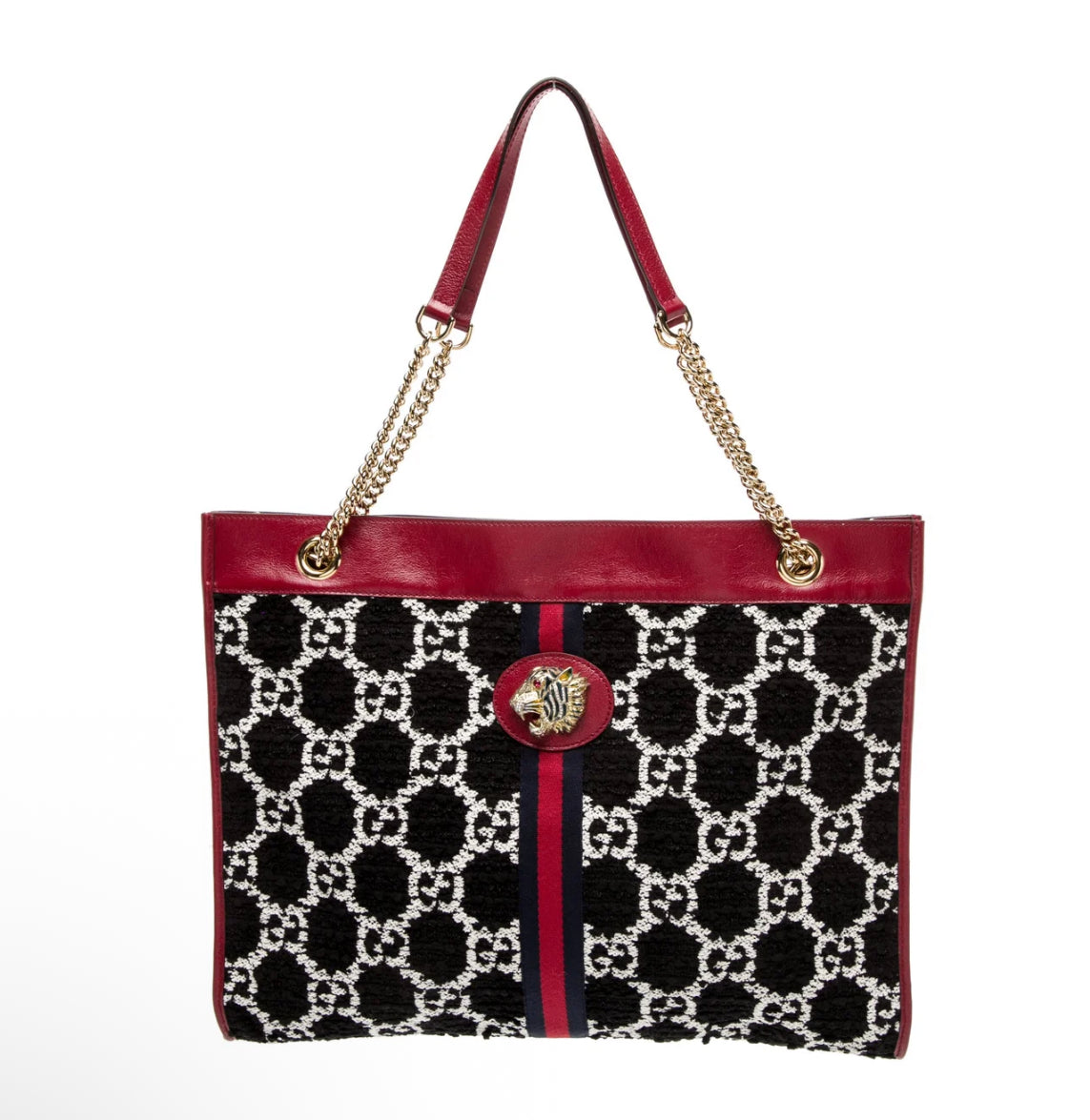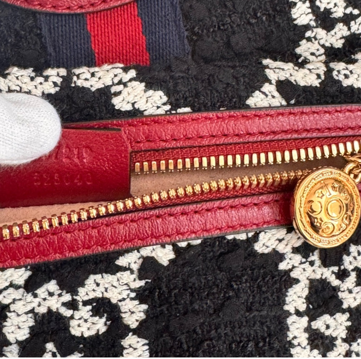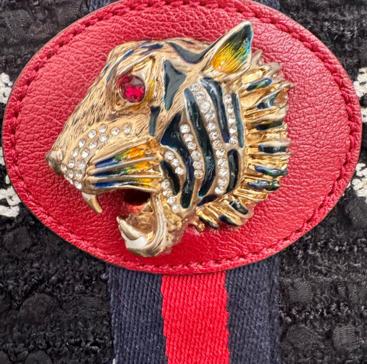 Elevate your everyday style with this authentic Gucci tote, expertly crafted in black GG jacquard with striking red leather trim and iconic Sylvie web accents. Featuring a dazzling gold-tone enameled tiger head medallion, this bag embodies bold sophistication and timeless Italian design.