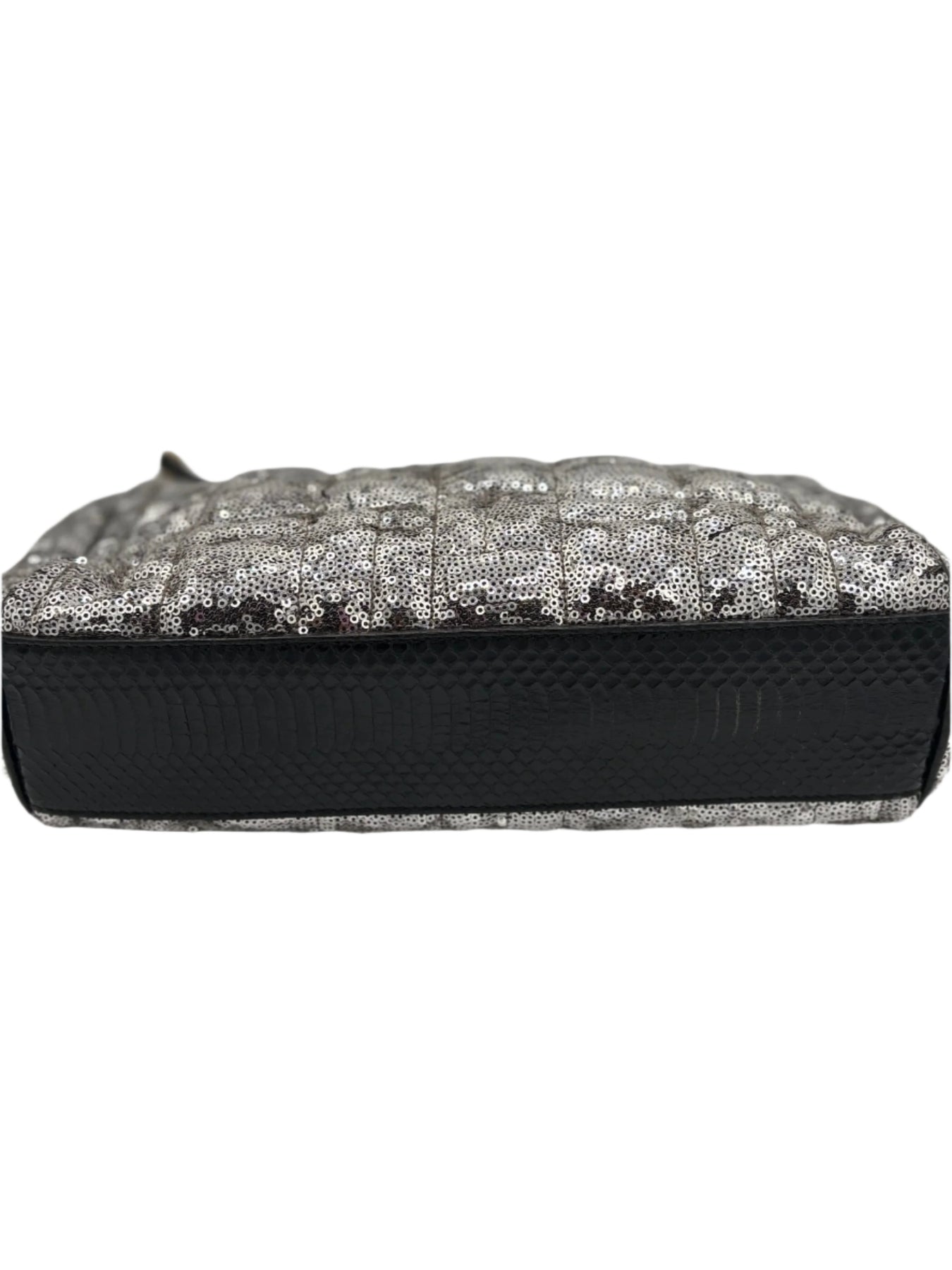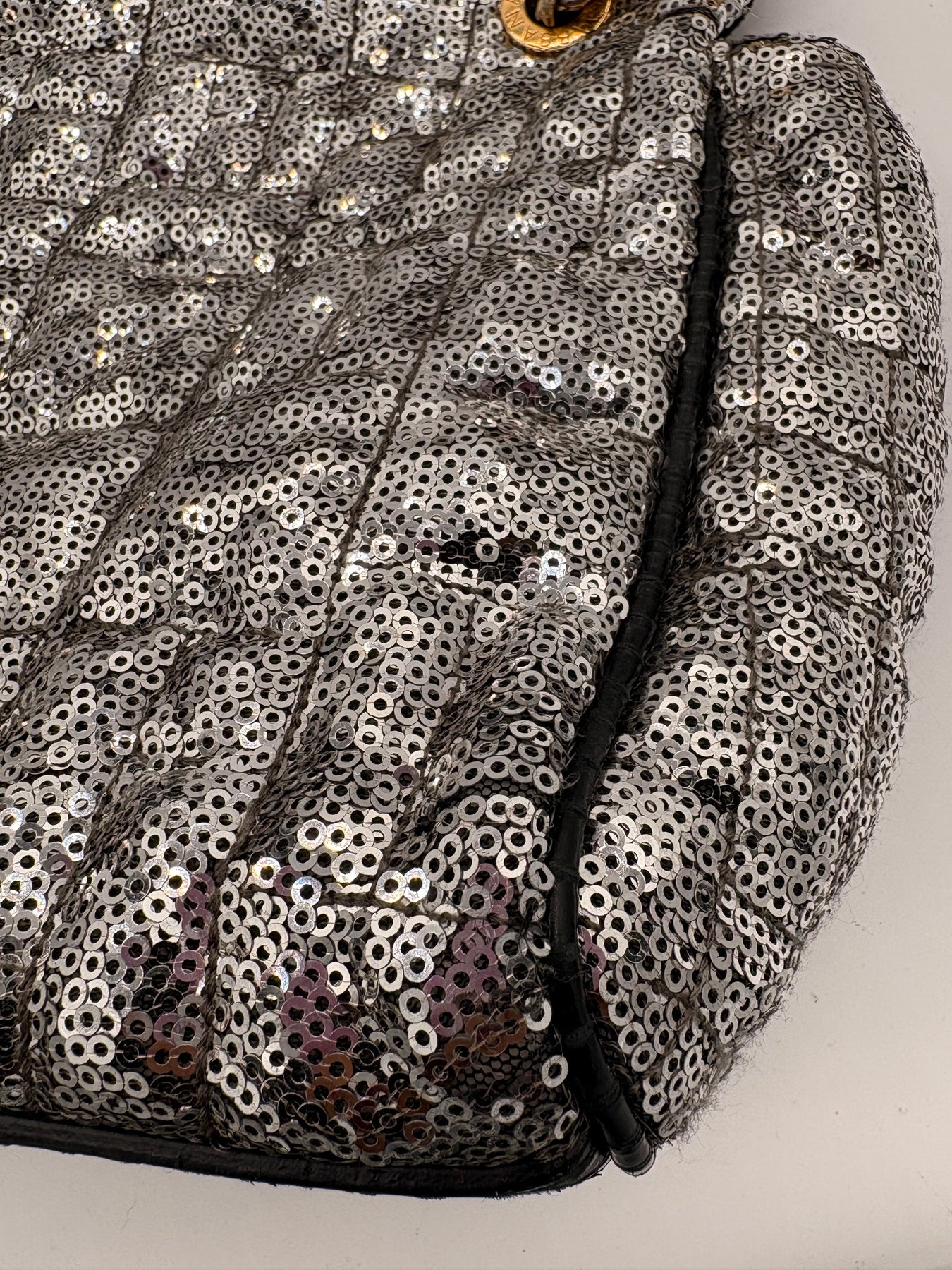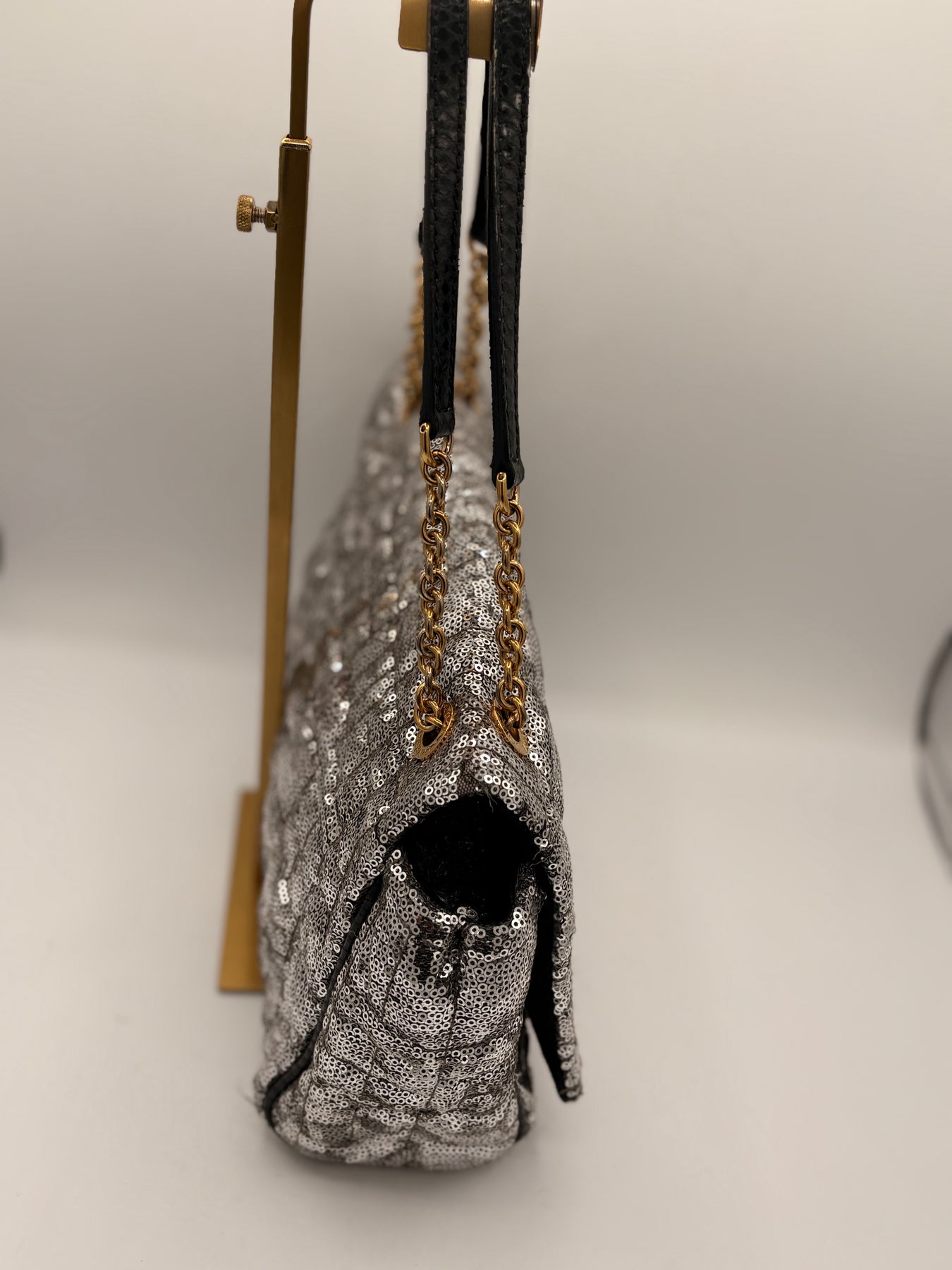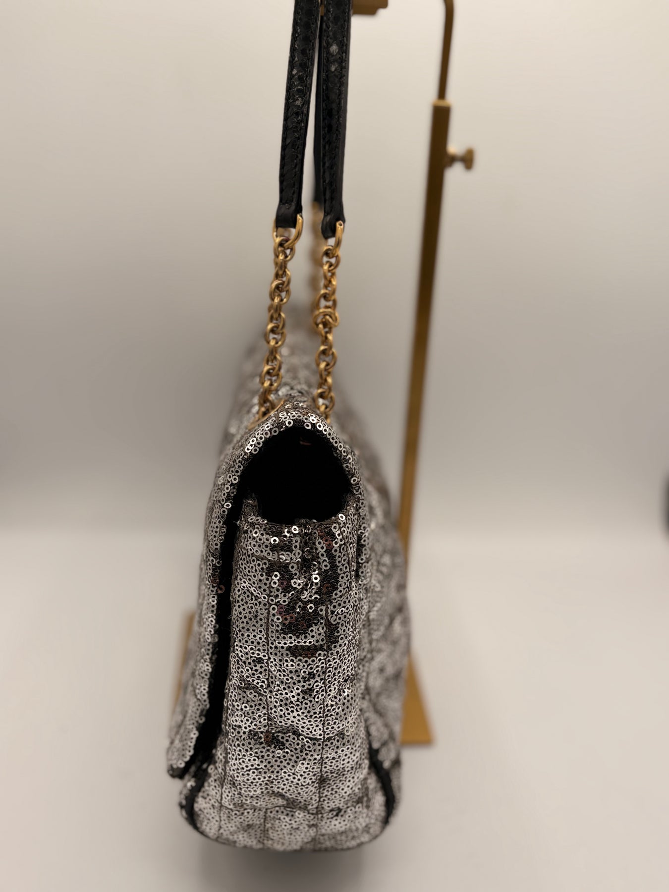 Sequined Leather Exterior: Dazzling silver sequins paired with gold tone hardware for a high-fashion look.