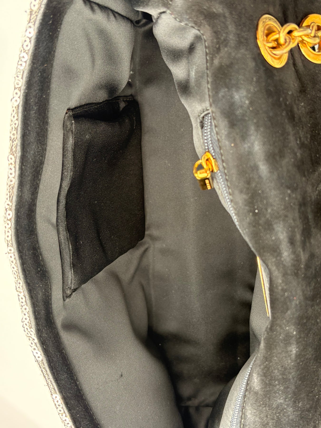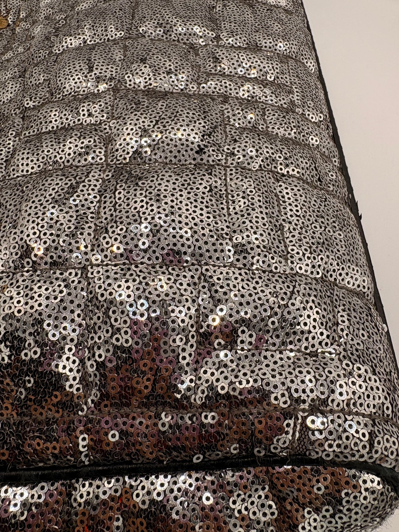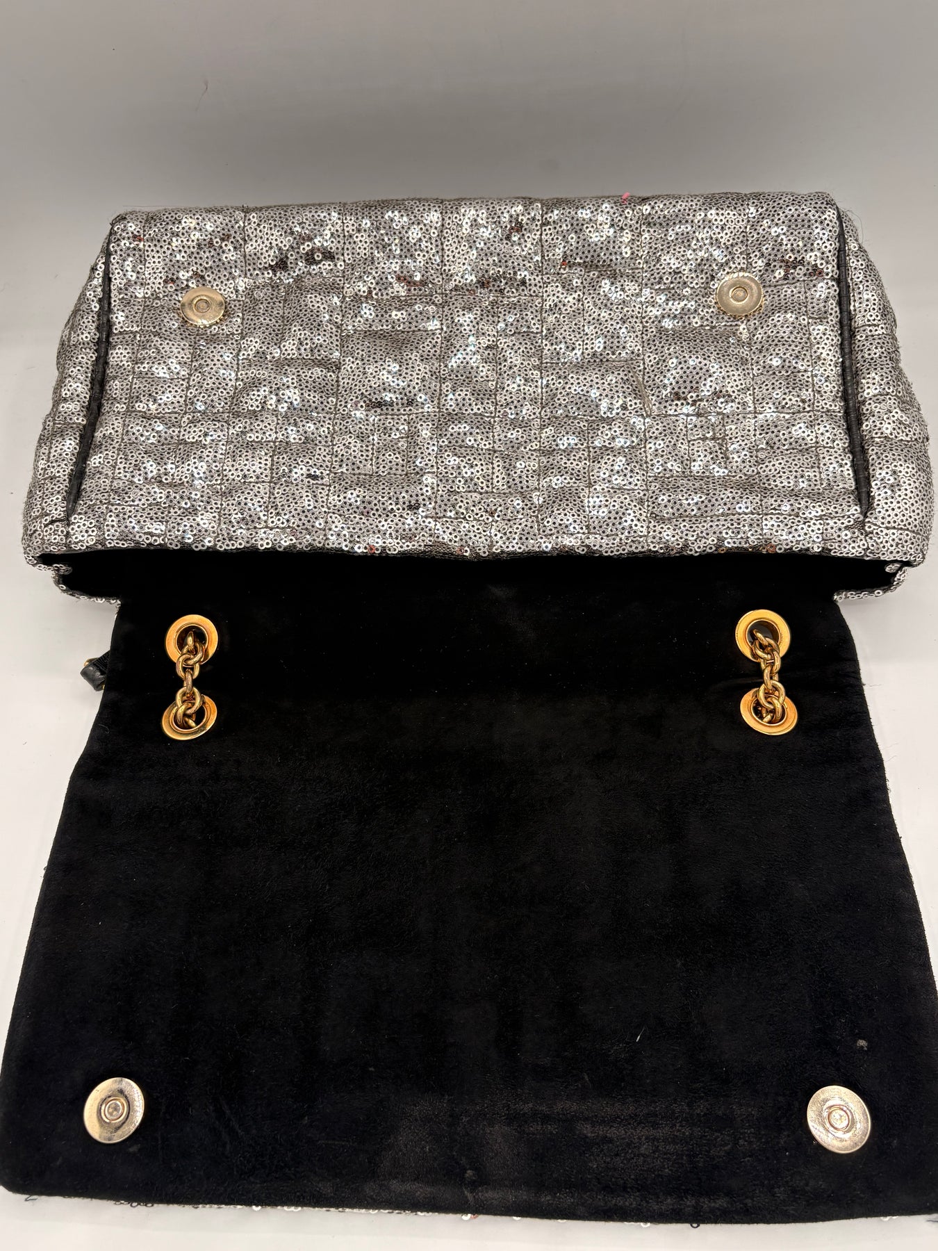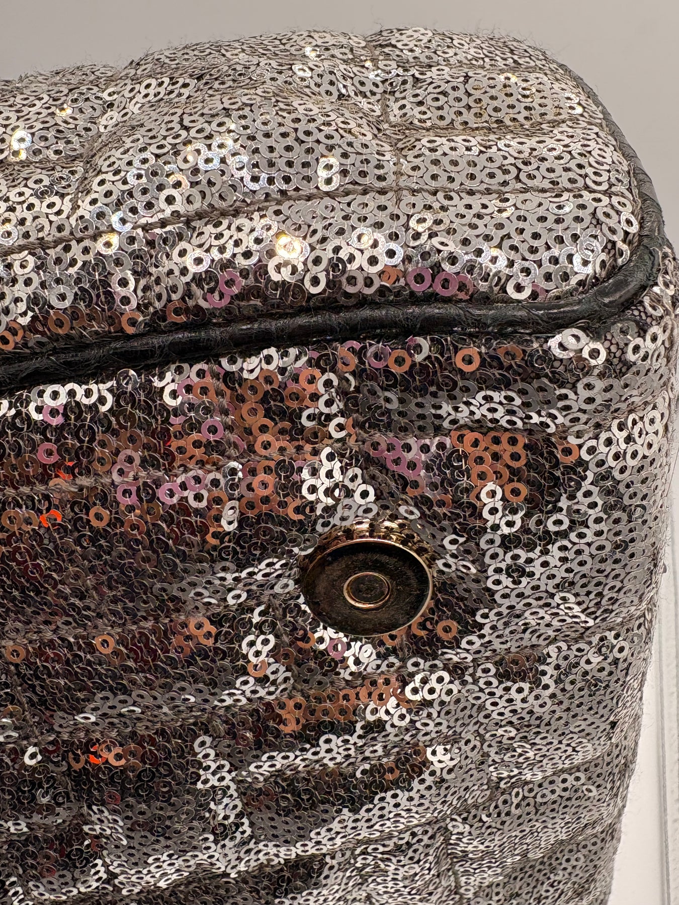 Sequined Leather Exterior: Dazzling silver sequins paired with gold tone hardware for a high-fashion look.