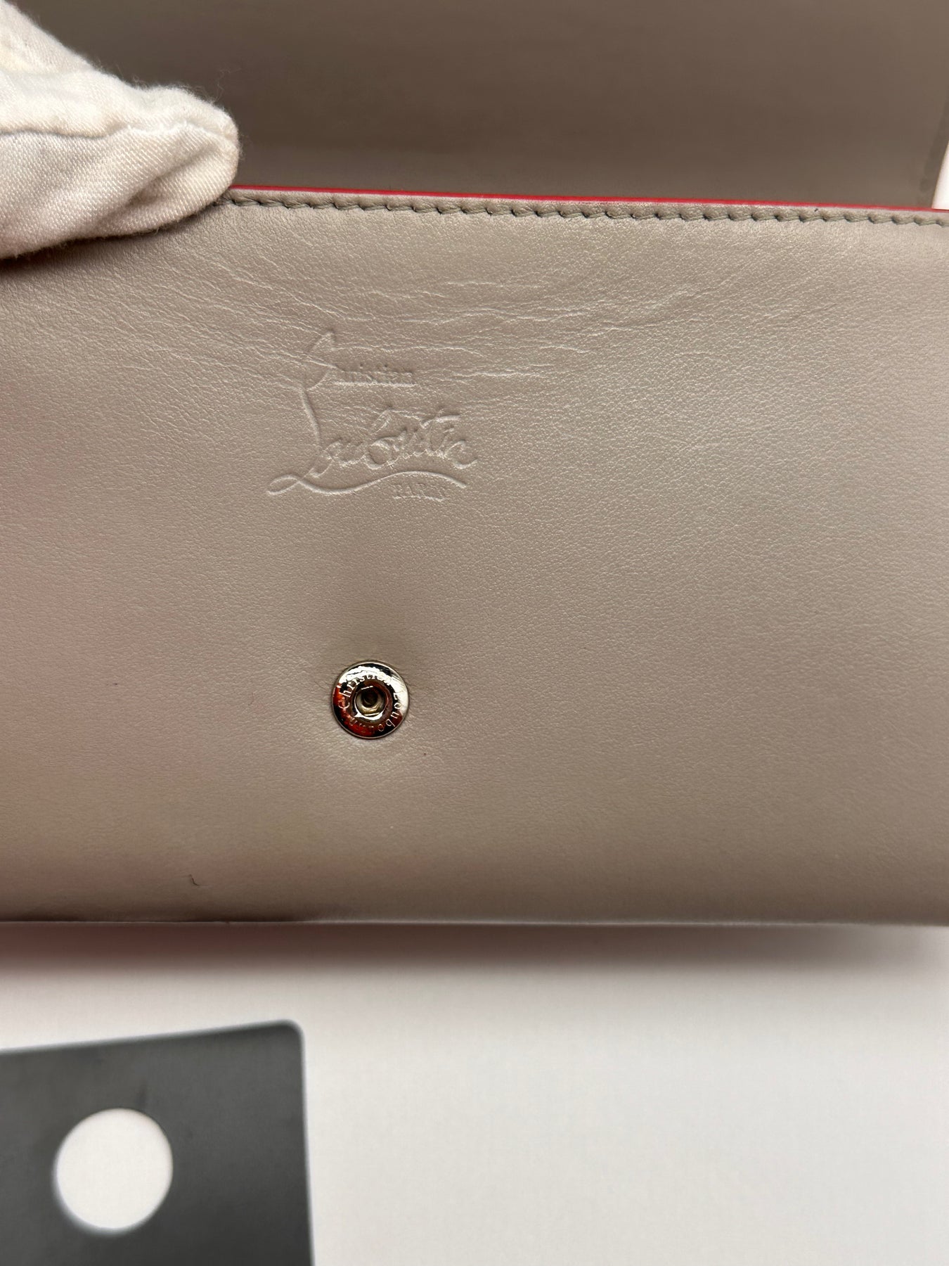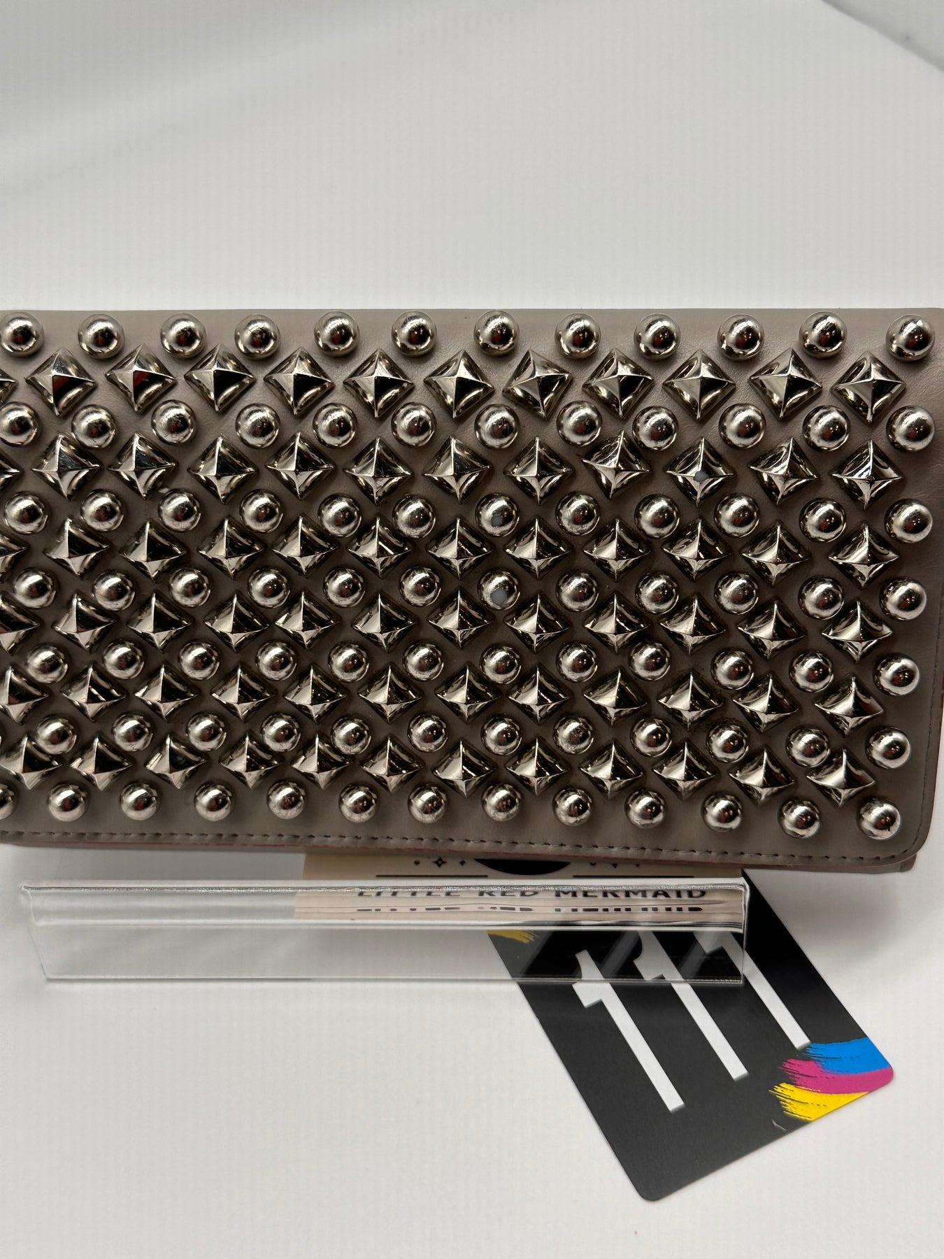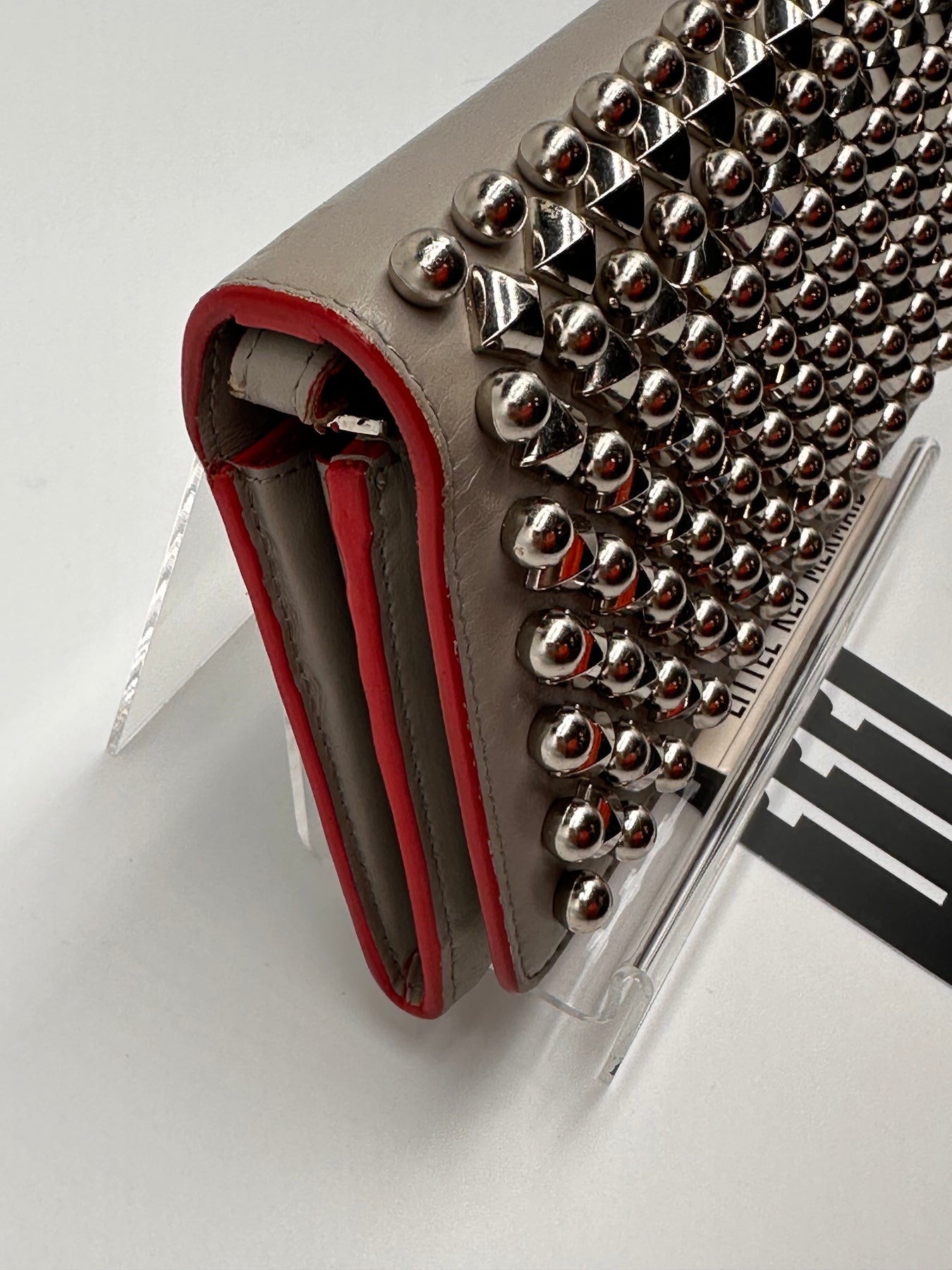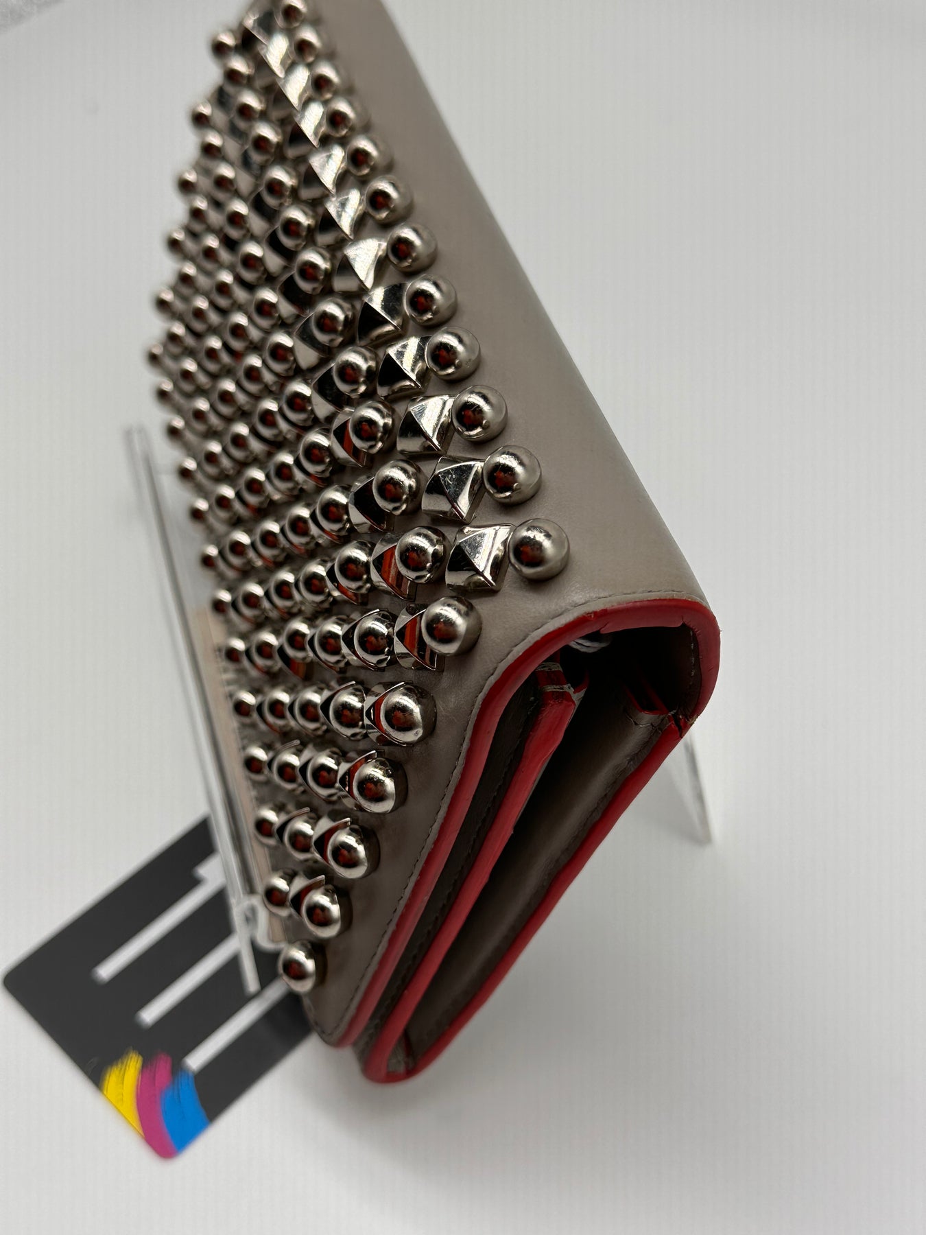 The Christian Louboutin Spiked Wallet is a true statement piece, featuring the brand's signature grey color and silver-tone hardware. The striking spikes add a bold, edgy touch, making this wallet a true head-turner.